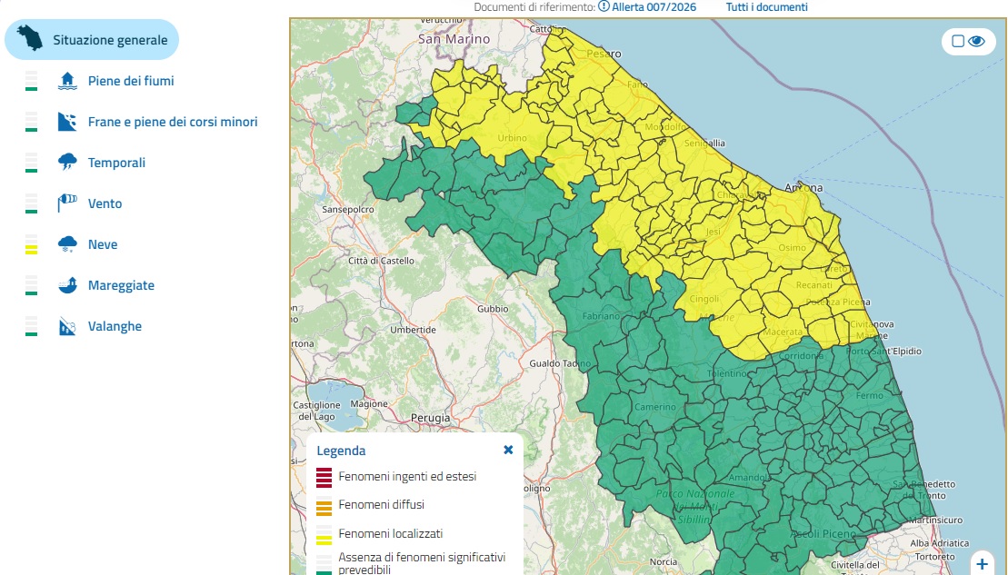 Dopo qualche fiocco di neve caduto in mattinata, per domenica 10 gennaio, sulle Marche torna l’allerta gialla per neve sulla fascia collinare e costiera dal pesarese fino al maceratese.