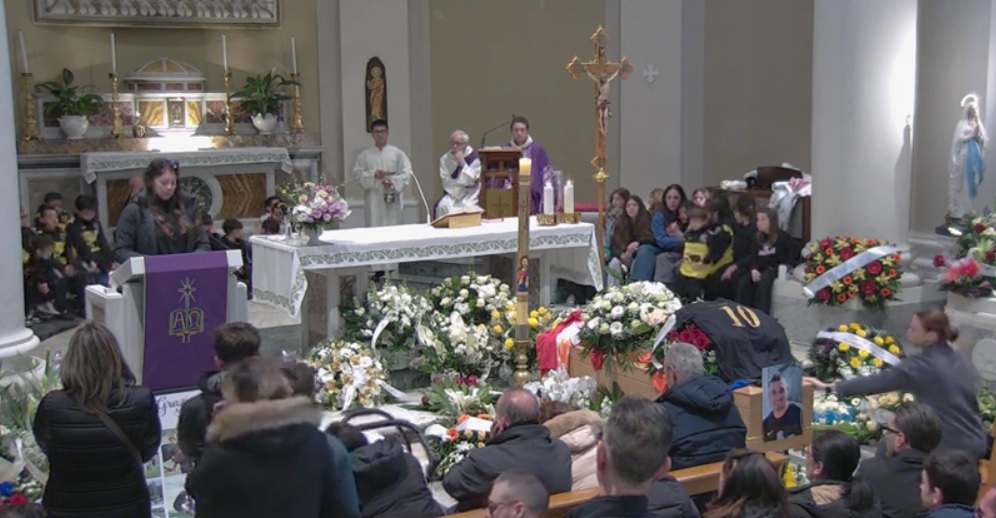 Per accogliere l’affetto della comunità, sono stati messi a disposizione il salone parrocchiale con altri 200 posti e le sale giochi dell’oratorio, collegate grazie a tre maxischermi e un impianto di filodiffusione, oltre alla diretta sul canale YouTube della parrocchia. Sul feretro, una sua foto sorridente, circondata dalle maglie e dalle sciarpe delle squadre per cui ha giocato – Fermana, Anconitana, Cingolana, Castelfidardo – simboli di una carriera vissuta con passione e dedizione.