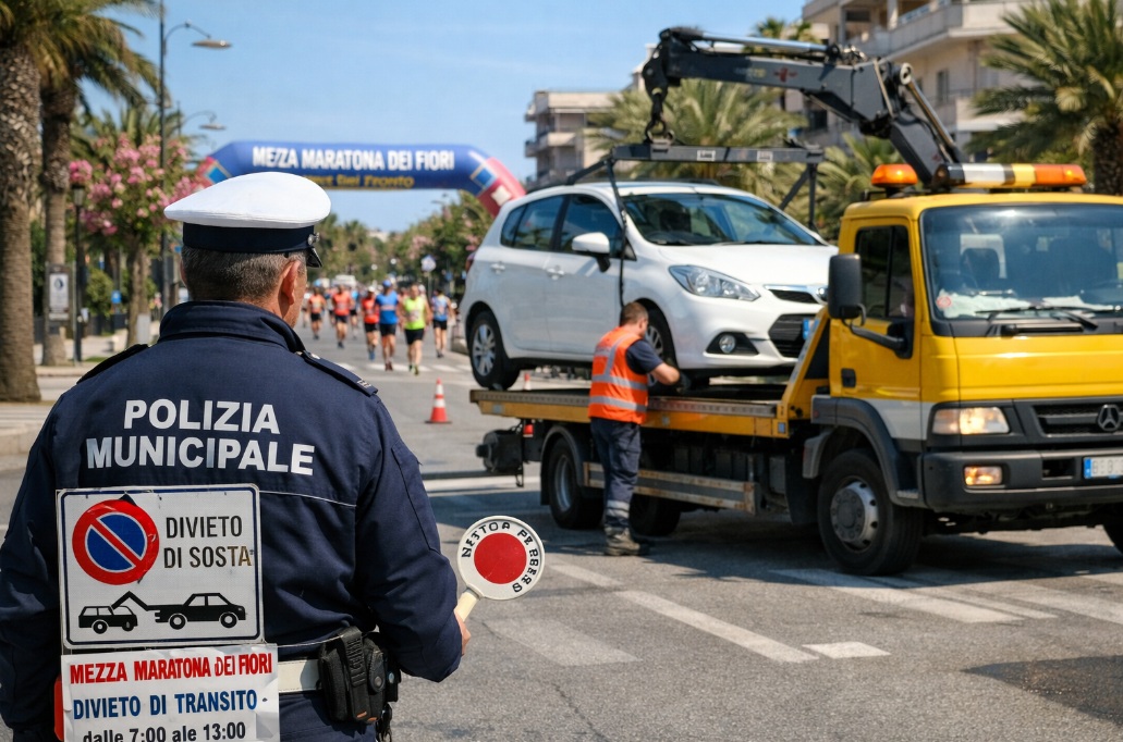 SAN BENEDETTO DEL TRONTO. Sono state 41 le auto rimosse nella mattinata di oggi a San Benedetto del Tronto in occasione della Mezza Maratona dei Fiori. I provvedimenti hanno riguardato i veicoli lasciati nelle aree interessate dal percorso della gara e soggette a divieti di sosta temporanei, predisposti per garantire lo svolgimento in sicurezza della manifestazione.
