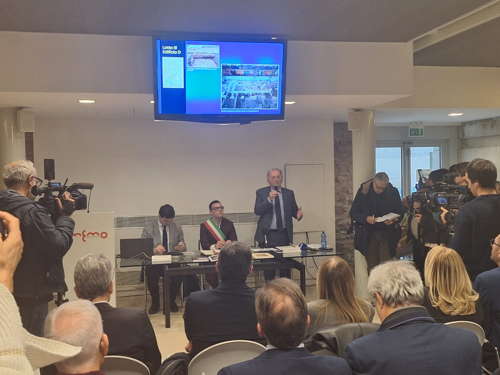 Conferenza stampa a Fano per annunciare un rinvenimento straordinario sugli scavi rinvenuti in piazza Andrea Costa, attraverso la scoperta di colonne di grandi dimensioni.